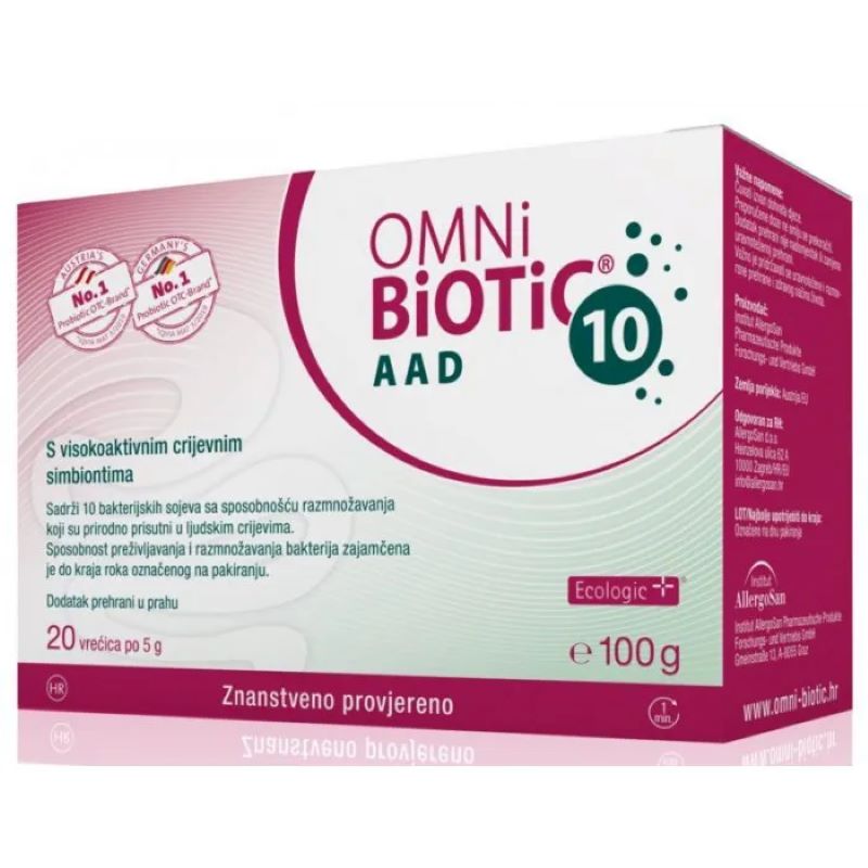 OMNI BIOTIC 10 AAD “Pro” uz antibiotik AAD = antibioticima asocirana dijareja dijetetski proizvod kao nadopuna terapiji antibioticima, posebice kod proljeva pospješuje regeneraciju crijevne flore nakon terapije antibioticima, ponajviše aktivnim bakterijama otpornima na želučanu kiselinu.